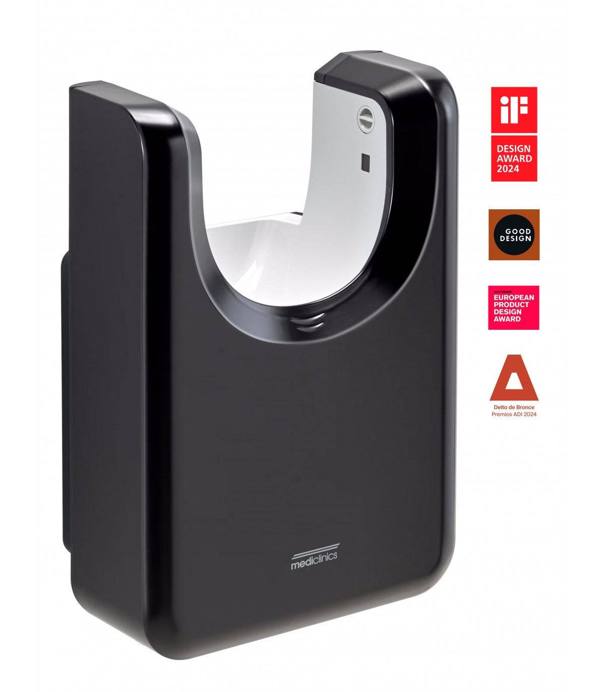 Nuevo secador de manos automático U-Flow®, modelo en forma de "U" hands-through, con carcasa de ABS, acabado negro.