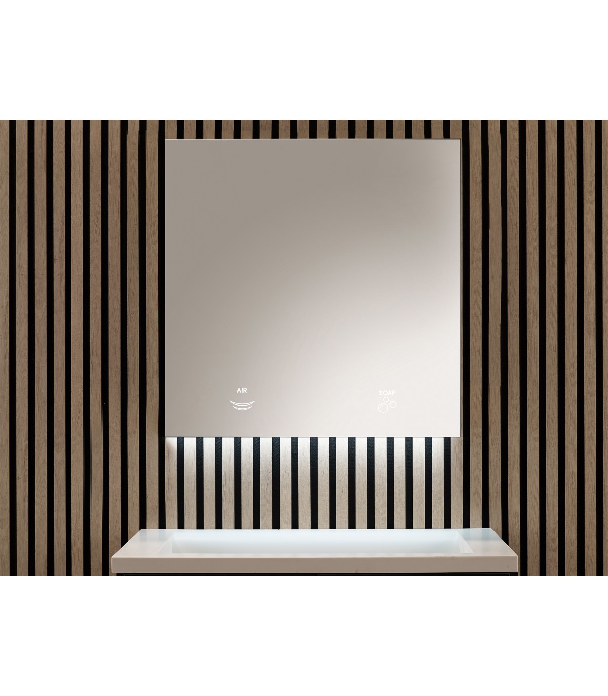 •El espejo dispone de pictogramas frontales retroiluminados para cada función (jabón y aire).